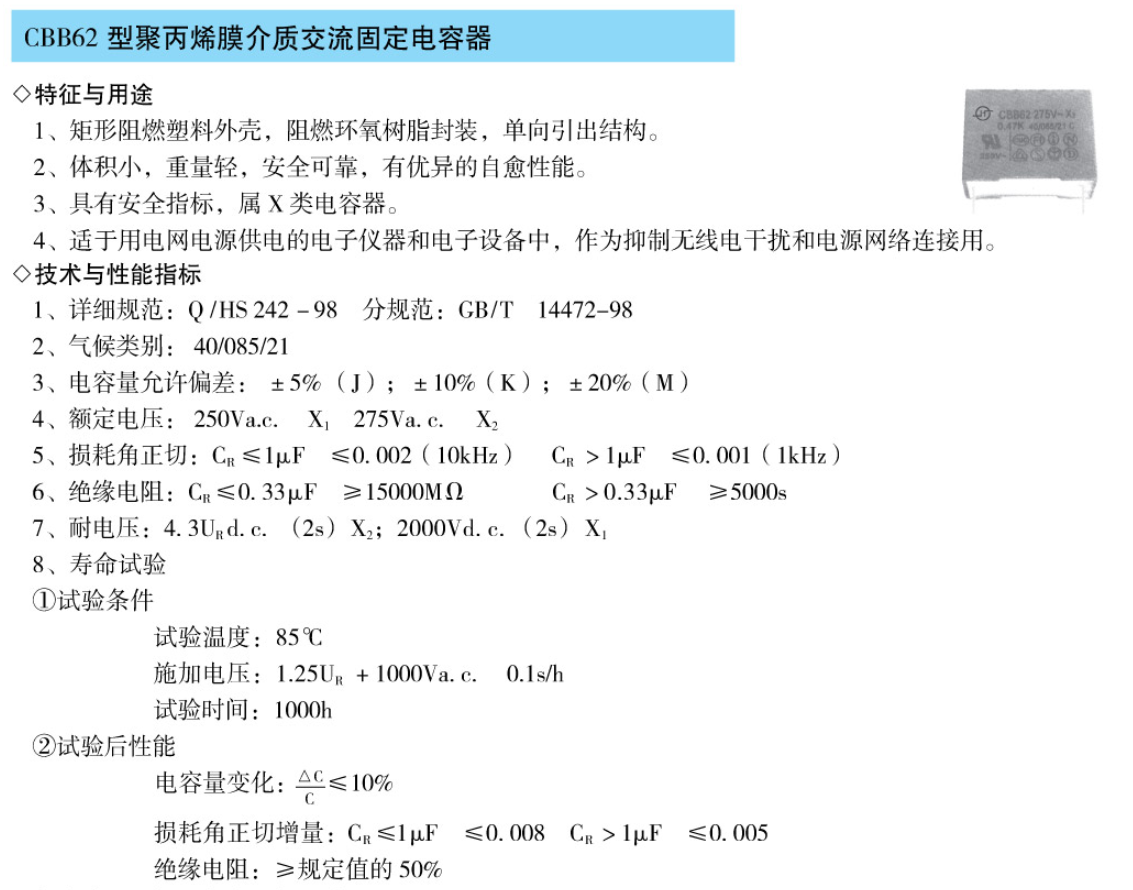 CBB62型金属化聚丙烯膜介质交流固定电容器