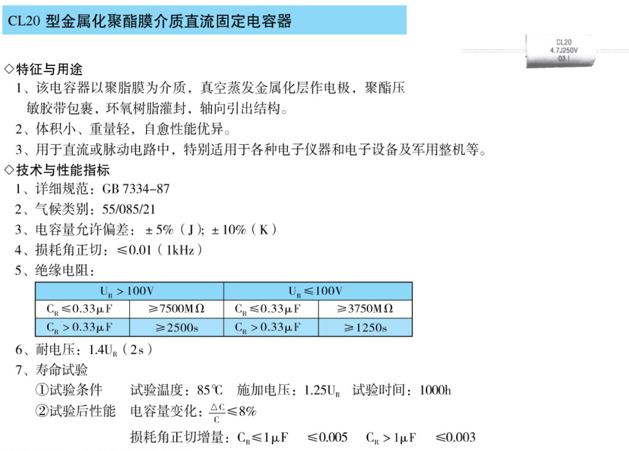 损耗角正切赠量:CR≤1μF ≤0.005